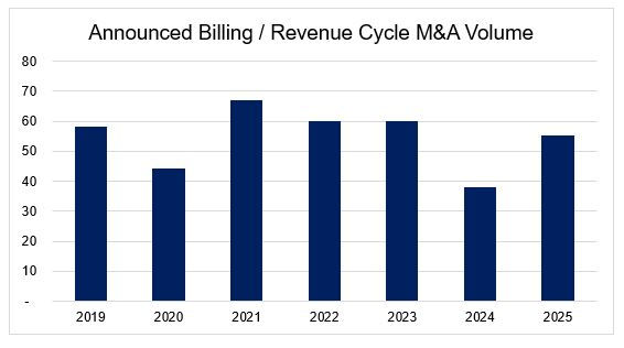 Announced RCM M&A transactions volumes have declined somewhat in recent quarters, alongside softness across much of the healthcare M&A market, but remain relatively strong compared to some sub-sectors. Announced deal volume peaked in late 2021 and remained elevated through 2023 before declining in 2024 and returning to near peak levels in 2025.